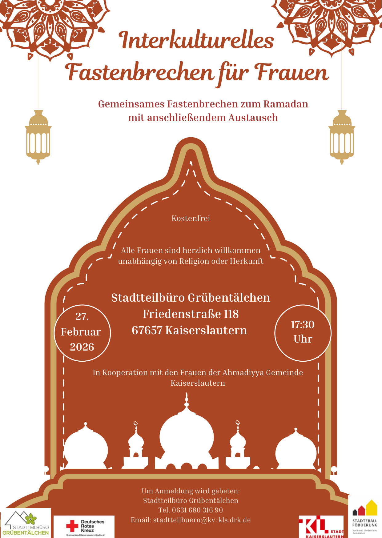 Im Rahmen des Monats Ramadan lädt das Stadtteilbüro Grübentälchen am 27. Februar um 17:30 Uhr zu einem interkulturellen Fastenbrechen für Frauen ein. Die Veranstaltung findet in Kooperation mit den Frauen der Ahmadiyya Gemeinde Kaiserslautern im Stadtteilbüro Grübentälchen statt. Eingeladen sind alle Frauen aus dem Stadtteil und darüber hinaus, unabhängig von Religion oder Herkunft. Ziel des […]